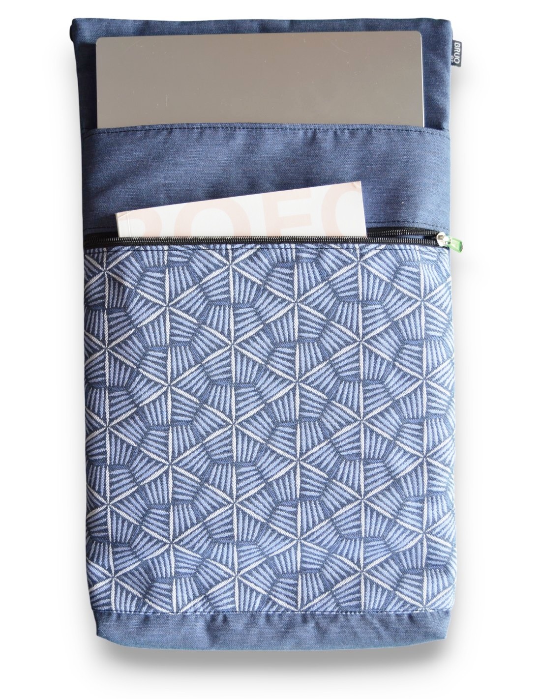 Funda d’ordinador artesanal confeccionada en tela jacquard, pensada per protegir el teu dispositiu en el dia a dia. Incorpora una capa de farciment interior que ajuda a amortir cops durant el transport i està totalment folrada per a una major protecció. Disposa d’una butxaca exterior amb cremallera, ideal per guardar carregador, cables o petits accessoris.