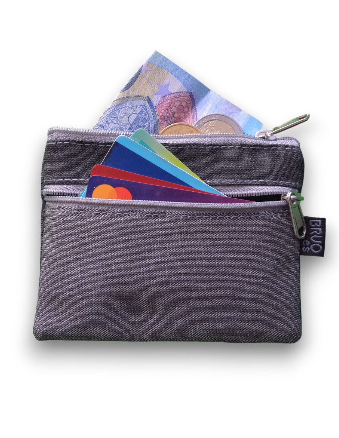 It features two lined zip pockets —one on top and one on the front— ideal for keeping coins, bills, cards or small items well organized and within reach.