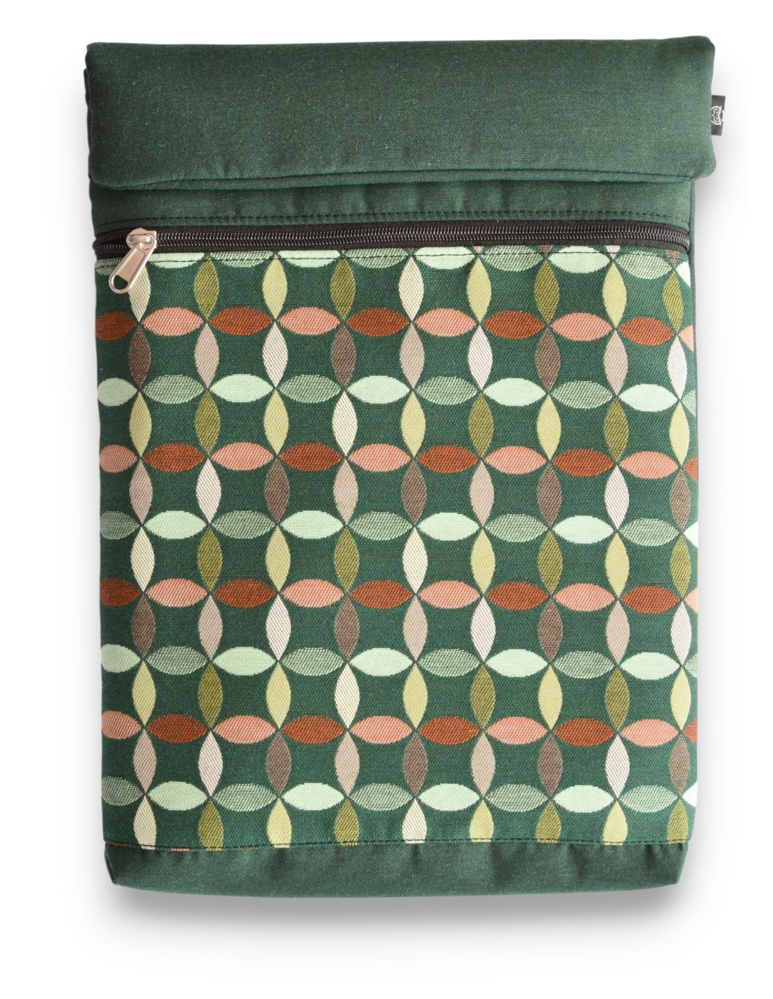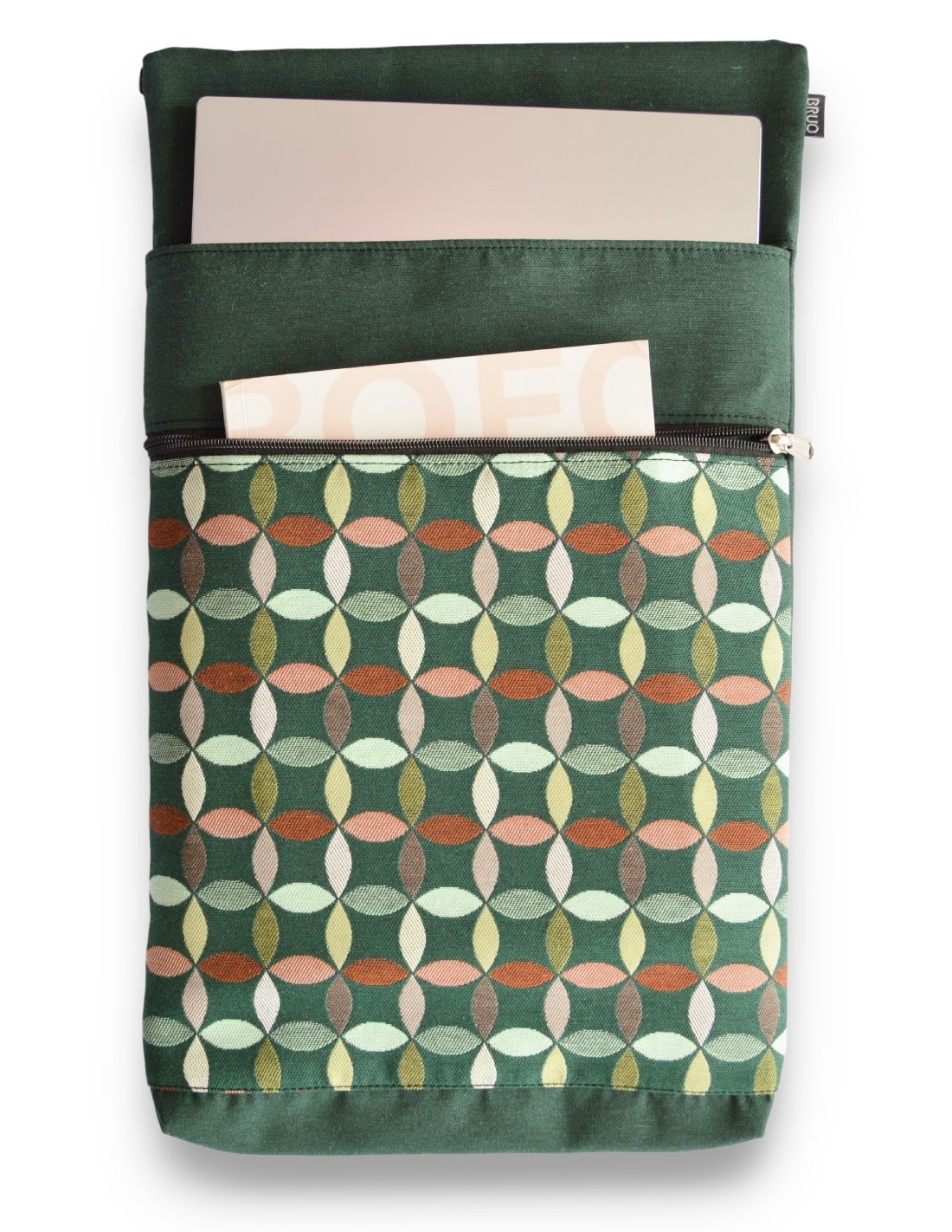 Funda de ordenador artesanal confeccionada en tela jacquard, pensada para proteger tu dispositivo en el día a día. Incorpora una capa de relleno interior que ayuda a amortiguar golpes durante el transporte y está totalmente forrada para una mayor protección. Cuenta con un bolsillo exterior con cremallera, ideal para guardar cargador, cables o pequeños accesorios.